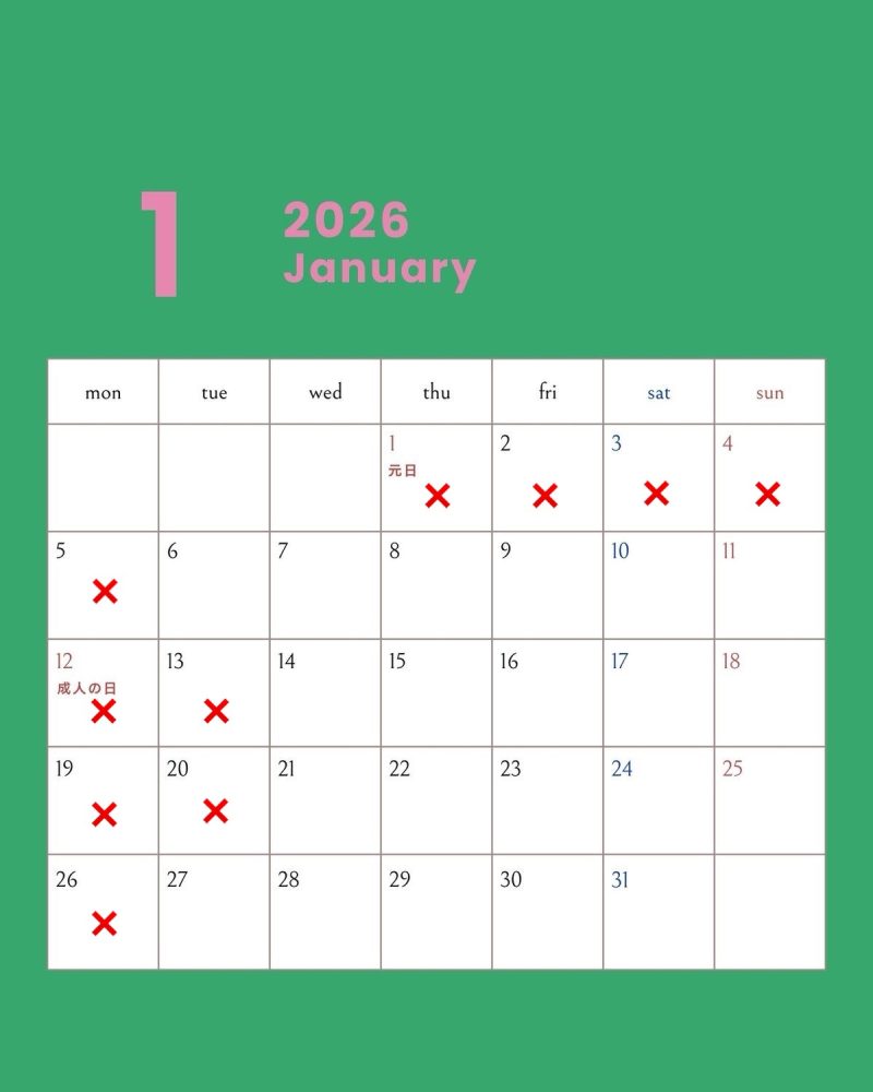 遅くなりましたが1月のお休みをお知らせいたします。